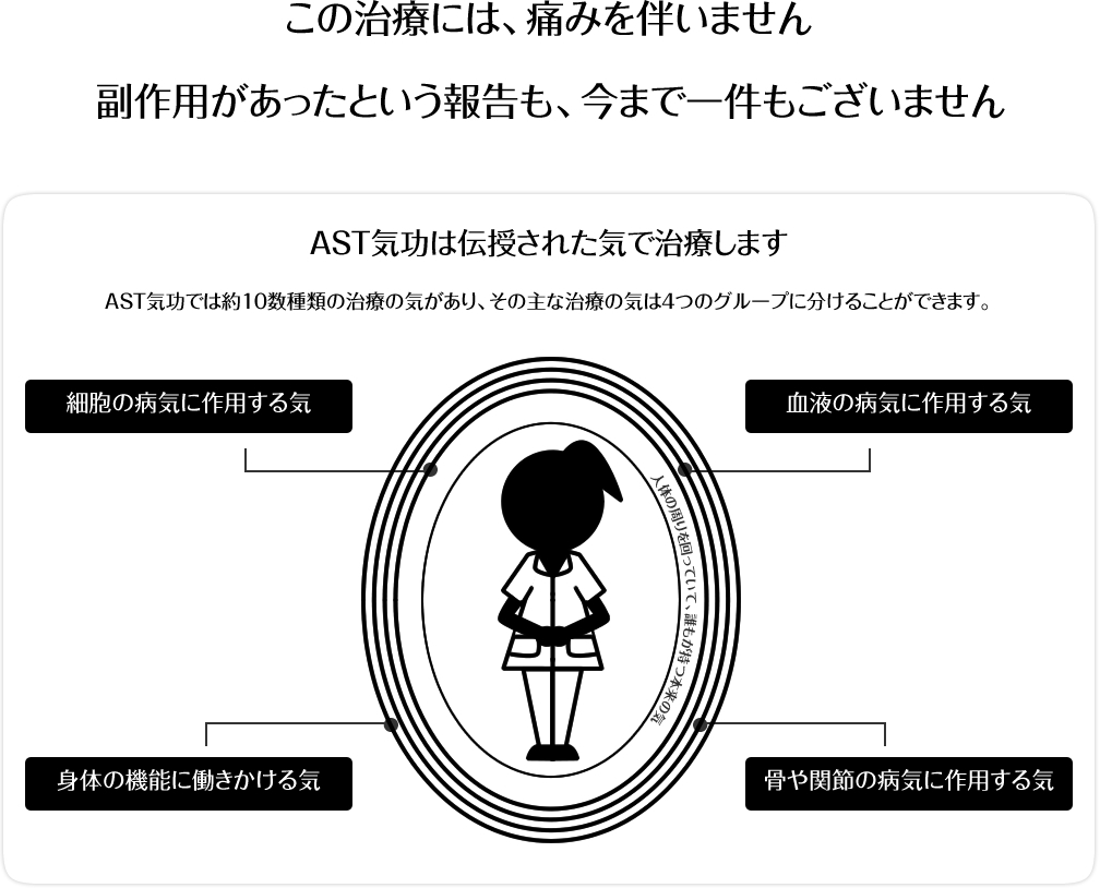 たとえ原因不明の病気であったとしても、いろいろなASTの気功の気を用いて 身体のあらゆる部位に対応することができる治療がAST気功なのです。
